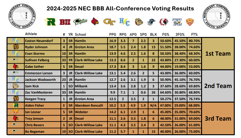 Sam Rick, a 6-foot, sophomore, point guard for the Bulldogs, was named to the 2025 Northeast Conference All-Conference teams. Rick was the only sophomore to make the first or second team. Easton Neuendorf of Hamlin was named the NEC Player of the Year for the second straight year.