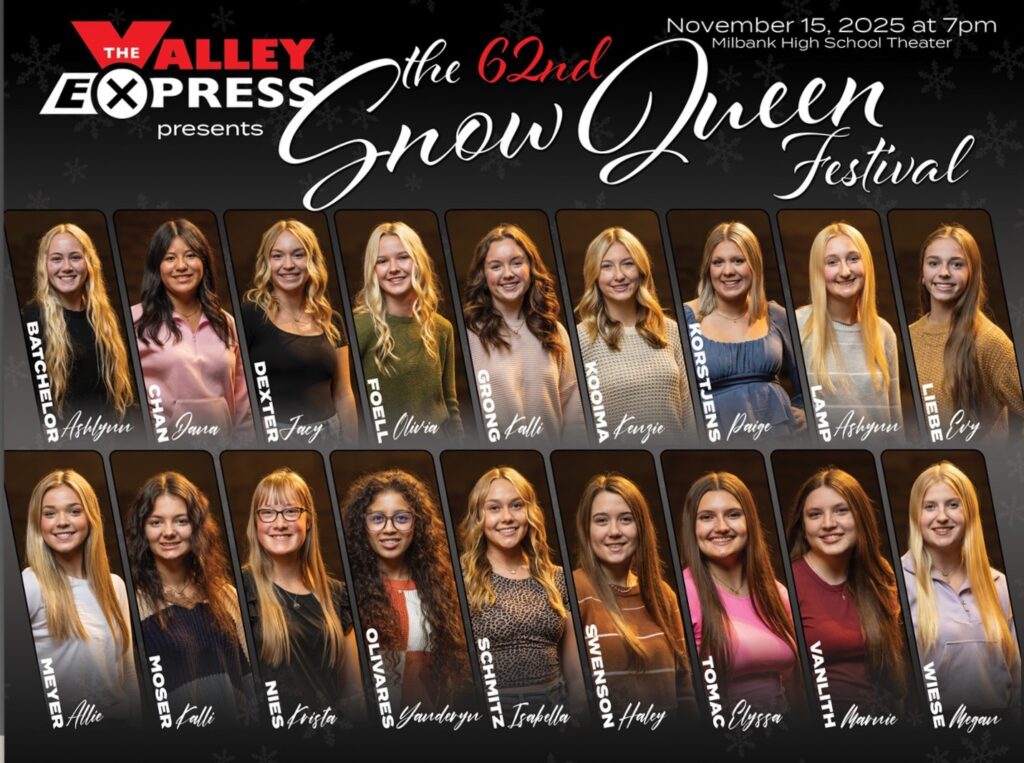 Who will be the new Miss Milbank? The Valley Express will host the 62nd Annual Snow Queen Festival on Saturday, November 15. Step into a Winter Wonderland of beauty and entertainment. See 18 lovely high school seniors vie for the title of Miss Milbank 2026. Enjoy the special magic as 24 kindergarten princesses discover the lucky winner and who will be Little Miss Milbank 2026.