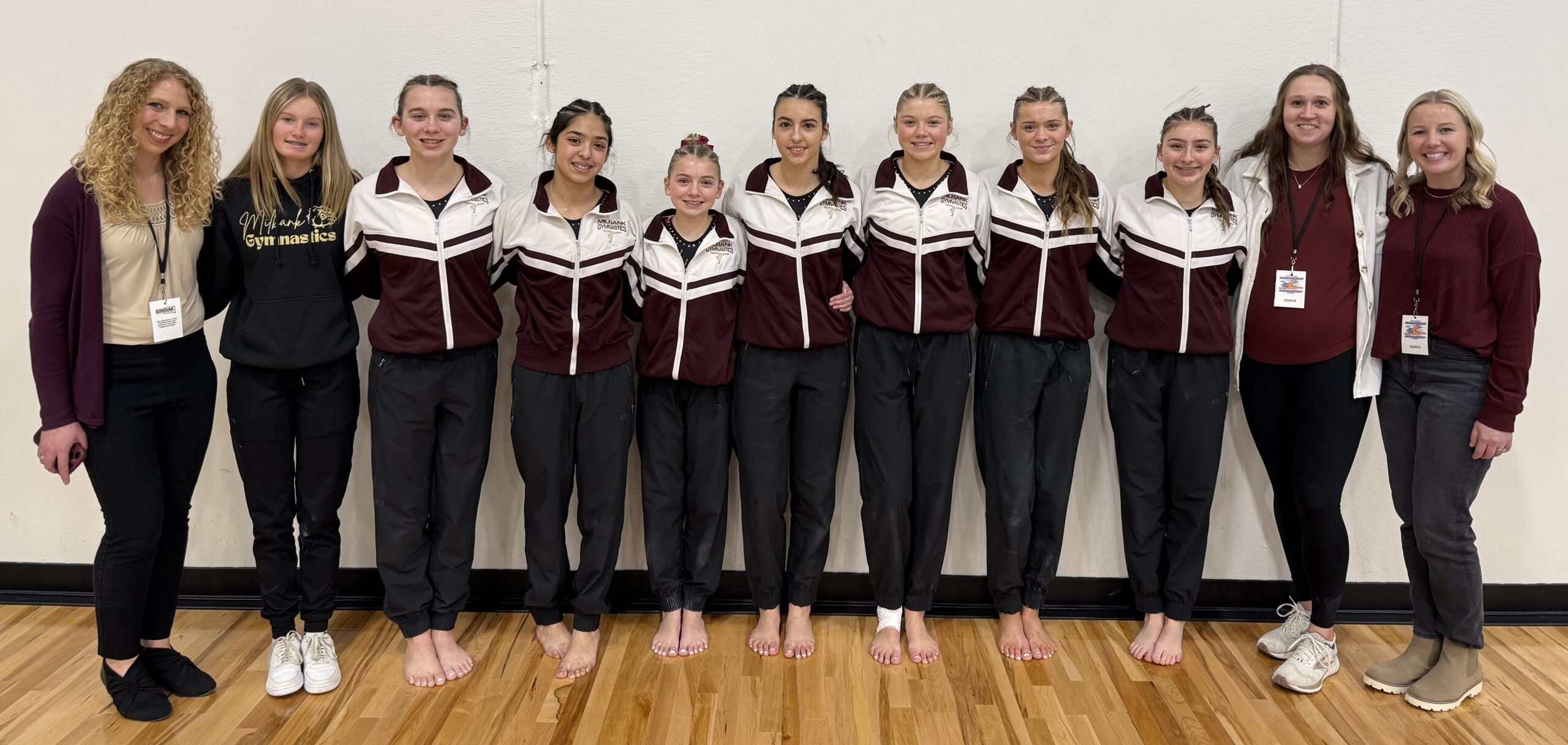 MHS junior Macyn Dunnihoo took 11th place on the Floor and sophomore Raina Untalan took 12th place in the Vault competition at the 2026 Class A South Dakota State Gymnastics Championships. The meet was held in Mitchell on Friday and Saturday, February 13-14. Milbank freshman Aria Prasnicki and eighth-grade Timbree Sporser each recorded a personal best score on the Bars. Freshman Jada Leigh Wellnitz and eighth graders Marley Pinkert and Nuria Rodriguez Duron also put up good scores for the Lady Bulldogs.