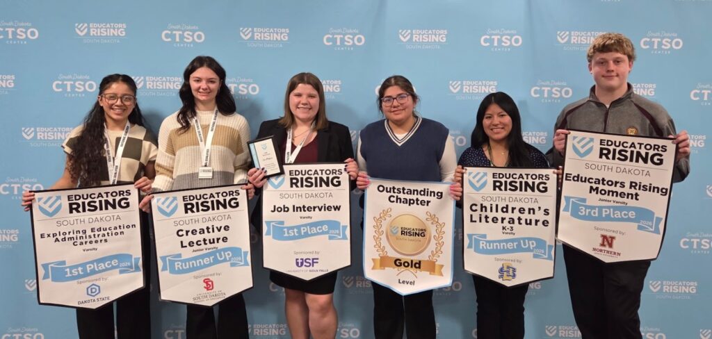 Milbank students excelled at South Dakota’s state competition of Educators Rising held on the campus of Black Hills State University in Spearfish from February 22-23. Our 400 students from across South Dakota competed. All eight MHS members who attended earned state recognition, and as a group, Milbank received the Outstanding Chapter Award. Five MHS students qualified for the national conference to be held June 20-23 in Portland, Oregon.