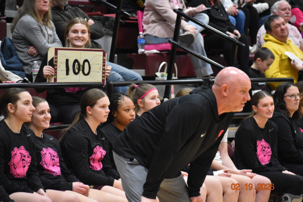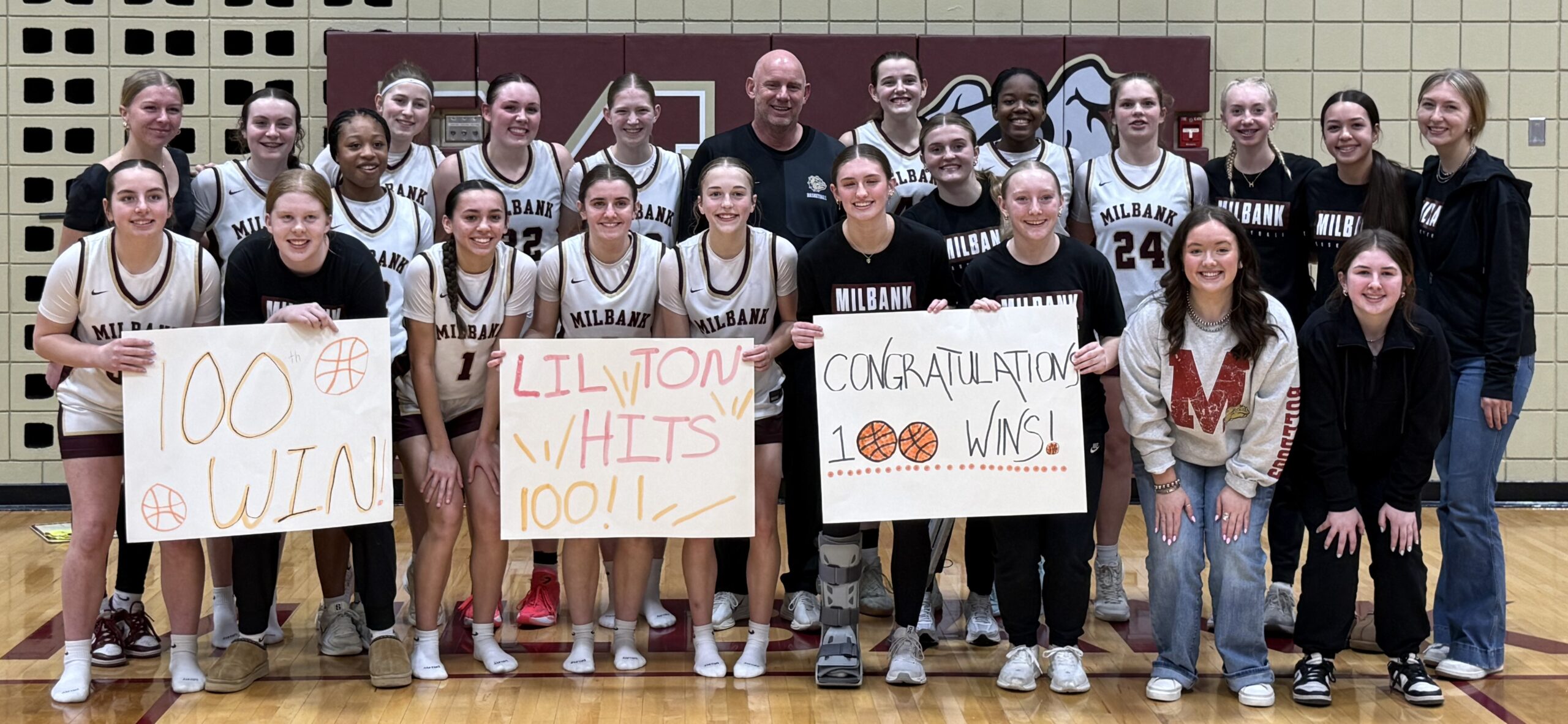 Tony Howard, head coach of the Lady Bulldogs, clinched his 100th career win with Milbank’s play-off victory over Redfield on Tuesday, February 24 ,in front of a packed house at the Milbank Armory. Fans, friends, and family helped celebrate the milestone and Coach Howard’s own players were some of the most thrilled. “The girls were so excited after the game, and that just meant sooooo much to me,” Howard commented. “It’s something I will never forget! No coach could ask for a better group of girls.”