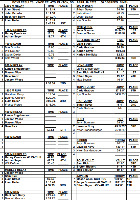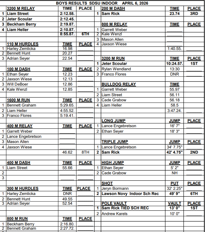 Jeter Scoular was first in the 3200-Meter Run. Liam Street, Scoular, Beckham Berry, and Liam Heller took first in the 3200-Meter Relay. Zemlicka was second in the 110-Meter Hurdles. Lance Engebretson, Allen, Kale Wenzl, and Jaxson Wiese took second in the 800-Meter Relay. Wiese, Heller, Street, and Rick placed third in the Medley Relay. Street, Cade Grabow, Adrian Seyer, and Zemlicka earned third in the Bulldog Relay. Heller was third in the 1600-Meter Run. E. Seyer took second in the High Jump. Novy was third in the Shot. Rick took third place in the Pole Vault competition.