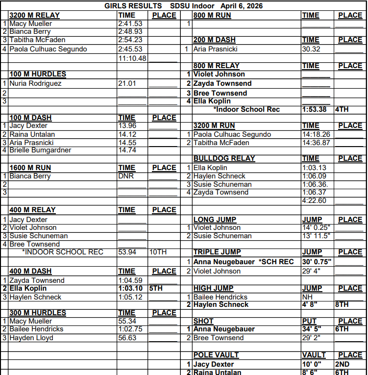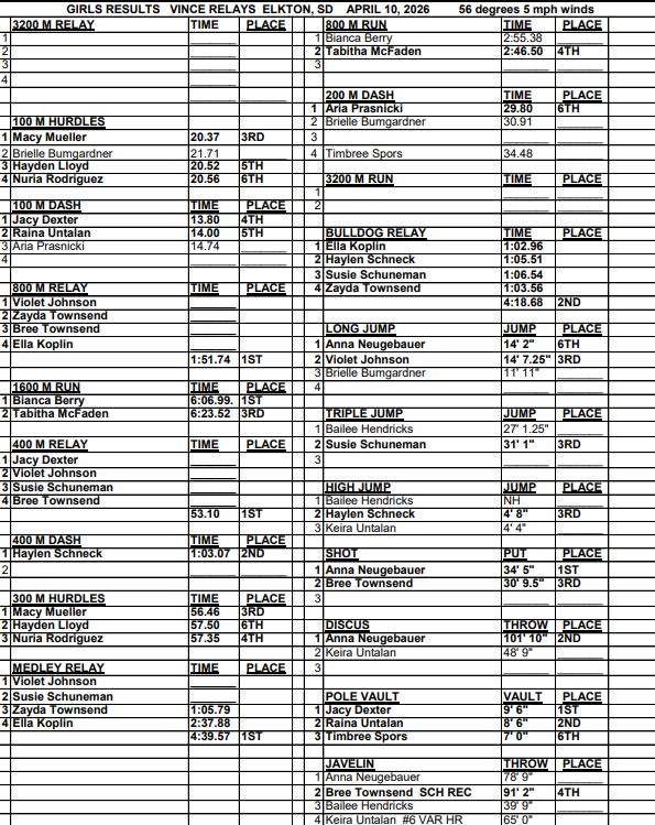 Johnson, Z. Townsend, B. Townsend and Koplin were first in the 800-Meter Relay. Dexter, Johnson, Schuneman, and B. Townsend took first in the 400-Meter Relay. Macy Mueller took third in the 100 and 300-Meter Hurdles. Bianca Berry was first and Tabitha McFaden took third in the 1600-Meter Run. Haylen Schneck was second in the 400-Meter Dash and third in the High Jump. Koplin, Schneck, Schuneman, and Z. Townsend took second in the Bulldog Relay. Johnson, Schuneman, Z. Townsend and Koplin took first place in the Medley Relay. Johnson was third in the Long Jump. Schuneman was third in the Triple Jump. Neugebauer was first, and B. Townsend took third in the Shot. Neugebauer was second in the Discus. Dexter took first and Raina Untalan finished second in the Pole Vault.