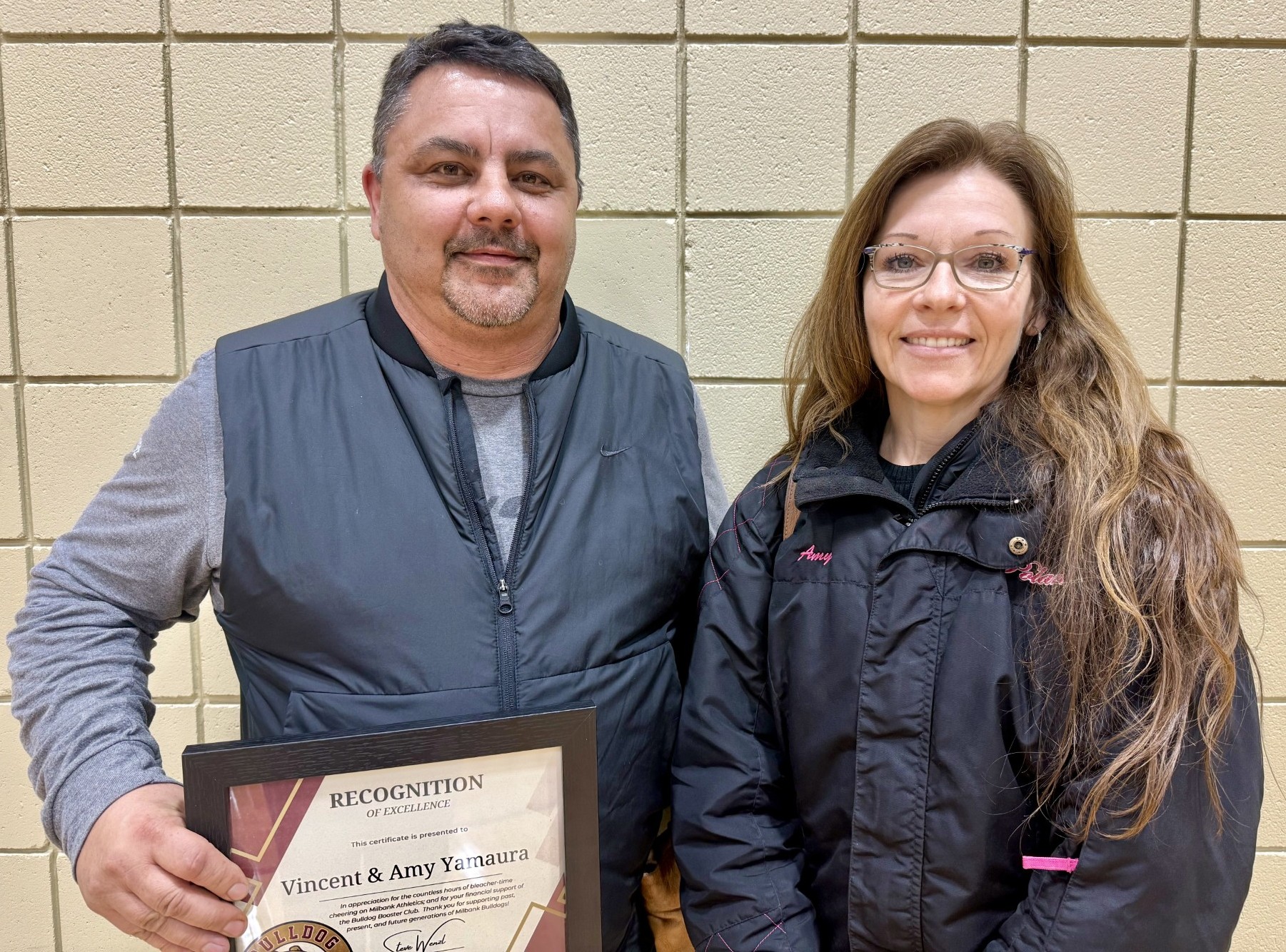 Vince (Bubba) and Amy Yamaura were honored for their outstanding dedication to Bulldog athletics at the Bulldog Booster Club’s annual meeting on Wednesday, April 8. The Yamauras were recognized for their unwavering support of student athletics by consistently attending events and contributing to the positive spirit of the Bulldog community.